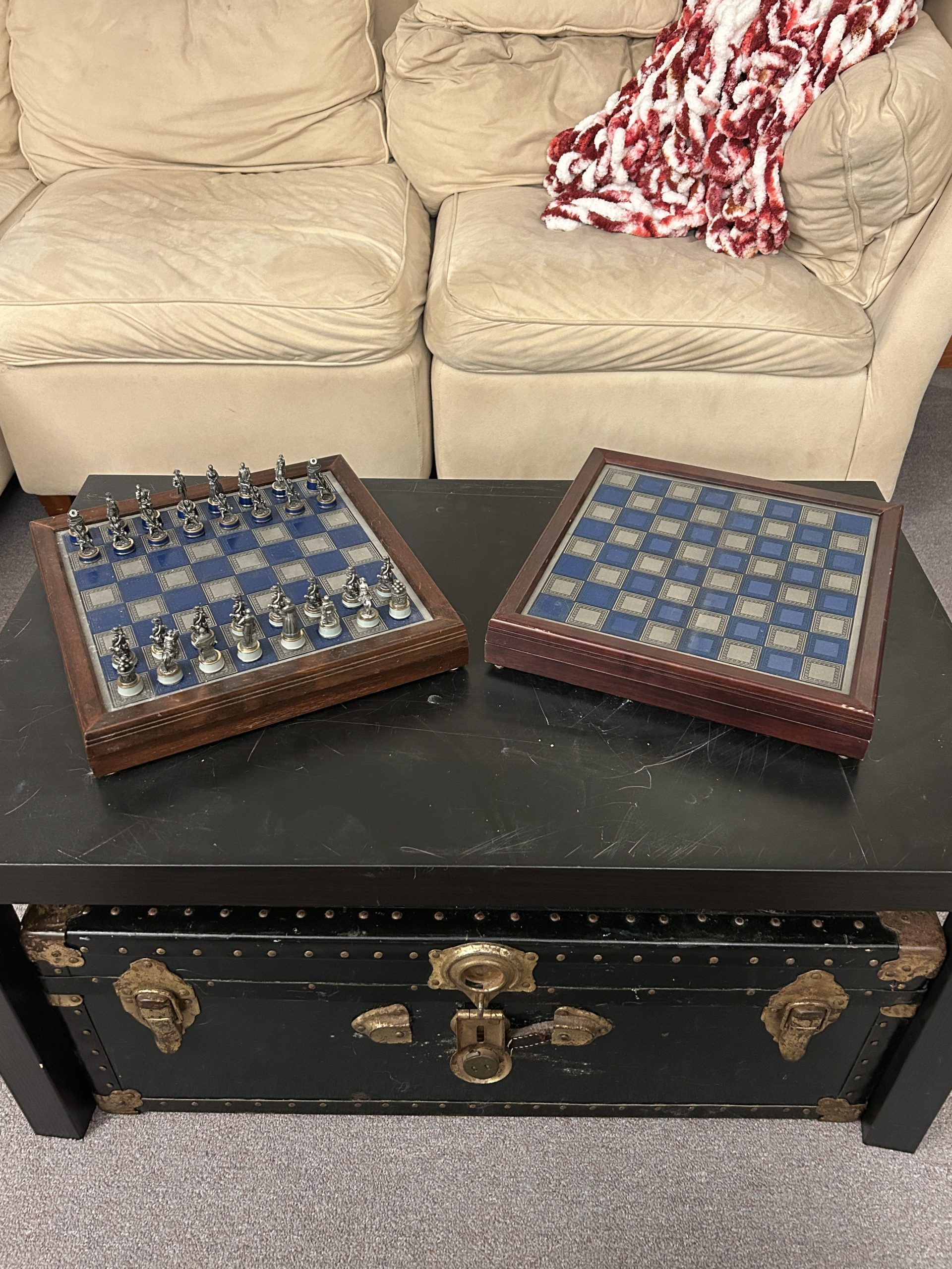 And so, having soothed most of my panic and shame, I buried the rest and forgot about the whole “incident.” Life moved on. I divorced, remarried, left my job at SUNY Potsdam and eventually left Potsdam, moving into the home I now occupy near Keeseville (again). We continue to enjoy this house, but still have some things to unpack. You know, all those “non-essentials” we collect throughout our lives. The things that have been living happily, largely unmissed, in our garage for the last two years. Well, we recently acquired and set up some shelving in the basement which we can use to start unpacking those boxes. A few days ago I unpacked a few of them, including my box of Star Trek novels. As I dug through them, pulling them out five or six at a time, I got to the bottom of the box where sat…MY ORIGINAL CIVIL WAR CHESS SET!