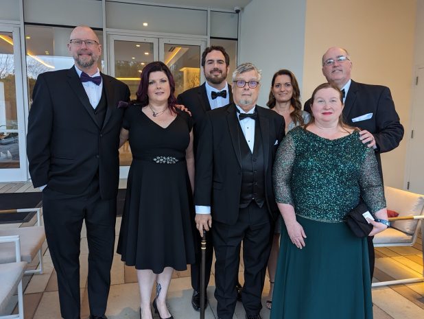 You’ll recall I mentioned that the jacket and pants were on the same hanger. Well, I apparently had not accounted for this when swapping jackets and had not packed the pants! So with an hour to go, I had three options: 1) try and find pants in my size. 2) attend the event as a high society Zoom mullet: tux on top, khaki cargo pants on the bottom, or 3) don’t attend the event. I grabbed the car keys and took off for the mall. I remembered that JCPenney had a Big & Tall section. I started with Macy’s because that’s where I was able to find parking. It was a long shot because stores like Macy’s think everyone is built like a stick with a 28” waist and the ones who have let themselves go have a whopping 36” waist. I needed something a little bigger and Macy’s did not have it. JCPenney was at the other end of the mall, so I power walked there and made a beeline for the Men’s section. Black. I needed black. I found black. Stretchy, shiny black. Ew…no. Denim black. No. Suit pants black. YES! But not exactly in my size…2 inches too small at the waist. I have lost some weight since the new year and my regular pants had gotten loose to the point I had added a hole to my belt recently, so I thought these would fit, or at least fit well enough to get me through the evening. I searched for a changing room. It took a minute to find, and there was a line of at least 5 people, each with multiple items to try on. After waiting about 2 minutes (which felt like 20) I abandoned the idea of trying the pants and went in search of a checkout station. Another line! I found another one with a shorter line and more cashiers. The cashier was nice and asked if I have a phone number with them. No. She asked if I have a store credit card with them. No. She asked if I wanted to apply for one and save 35% on my purchase. “No,” I said as politely as I could muster with a smile, “I just want the damn pants.” Done. Power walk back through the mall and Macy’s and back to the car. Navigate the traffic of everyone seemingly trying to exit the parking garage at the same time. Made it back to the hotel with about 5 minutes to spare. I got back to the room and sent Amanda (who looked fabulous, by the way!) down to the lobby to explain what happened while I changed. The pants fit! And I could get away without my belt, which is brown. And I was reasonably sure they would not split. I got dressed in record time and made it to the lobby with minutes to spare before the limos arrived. *whew*. (In retrospect I can note that had I opted for the khaki cargo pants with my tuxedo jacket I would not have been at all out of place. There were some very interesting outfits on display!)